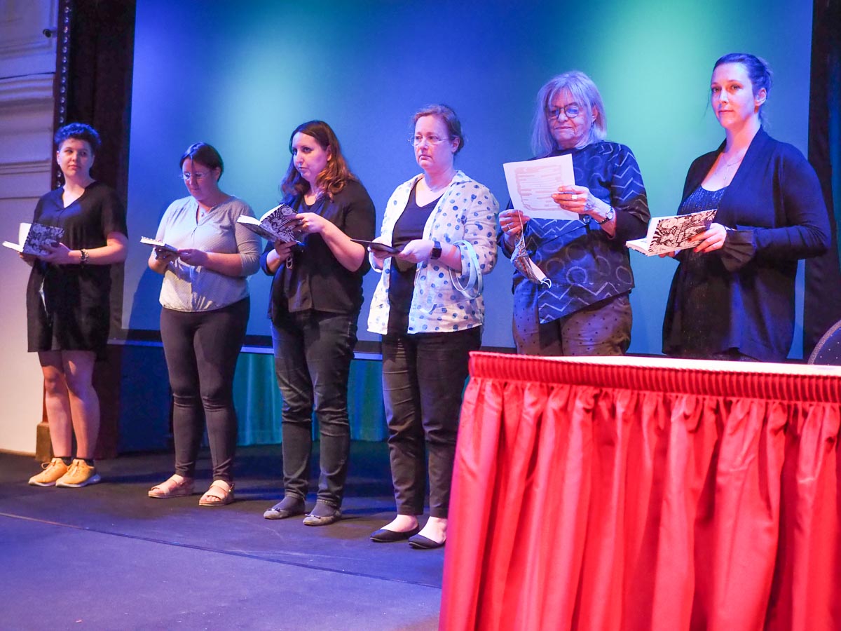 So beginnt die Lesung mit dem Text, den wir alle zusammen „blind“ geschrieben haben, immer eine Zeile, ohne zu wissen, wohin sie uns führt.